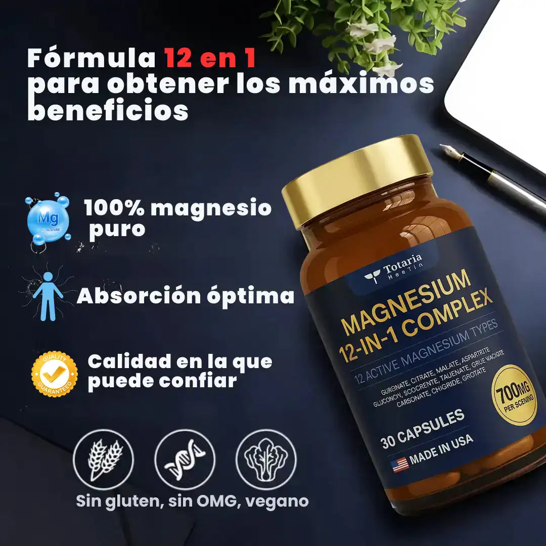 Cápsulas veganas de alta absorción con glicinato, citrato, malato y más para apoyar los músculos, los huesos, el corazón y la relajación.